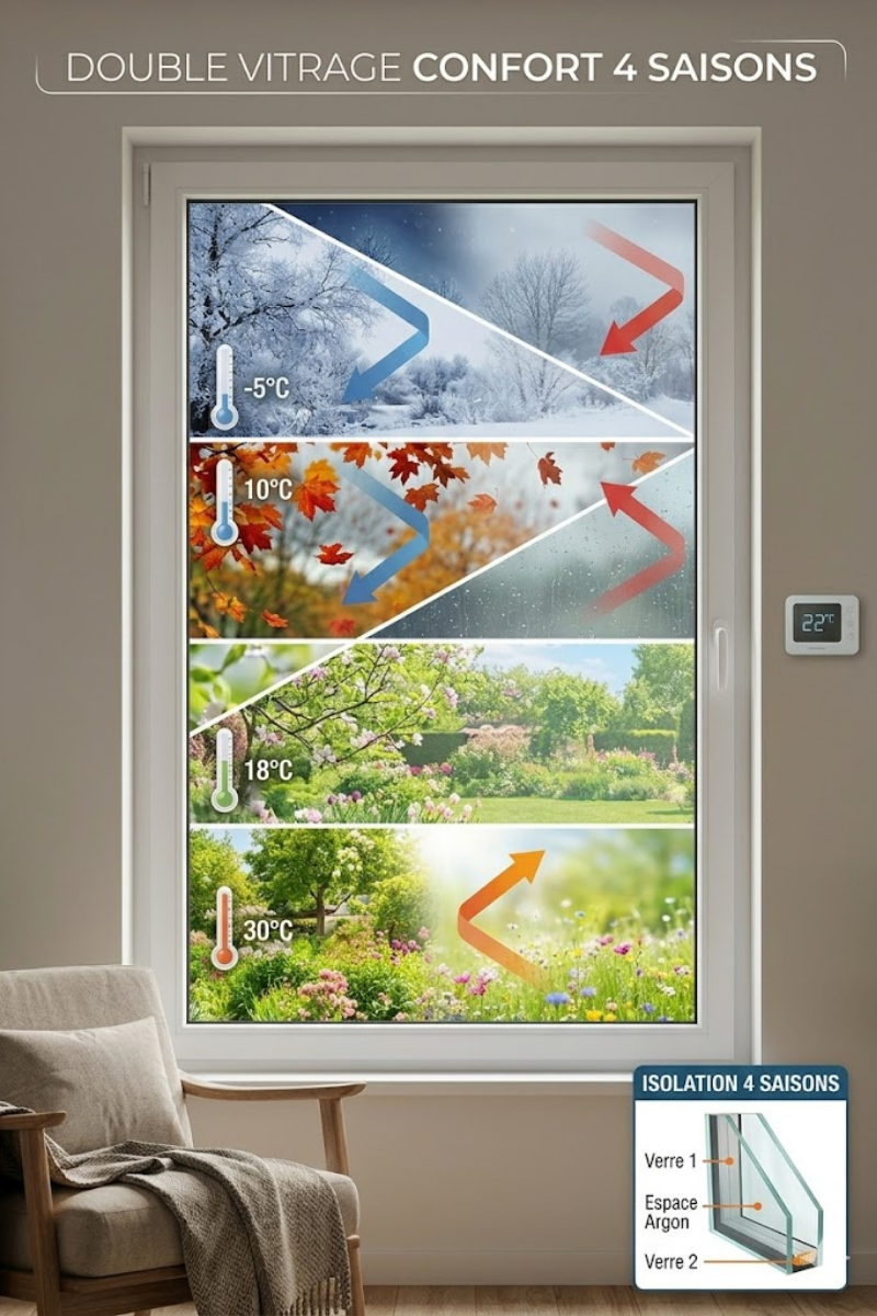 « Un double vitrage 4 saisons correctement installé peut réduire les besoins en climatisation de 25 à 40 % pendant les mois chauds, tout en diminuant les pertes thermiques hivernales de 30 % par rapport à un ancien double vitrage. »